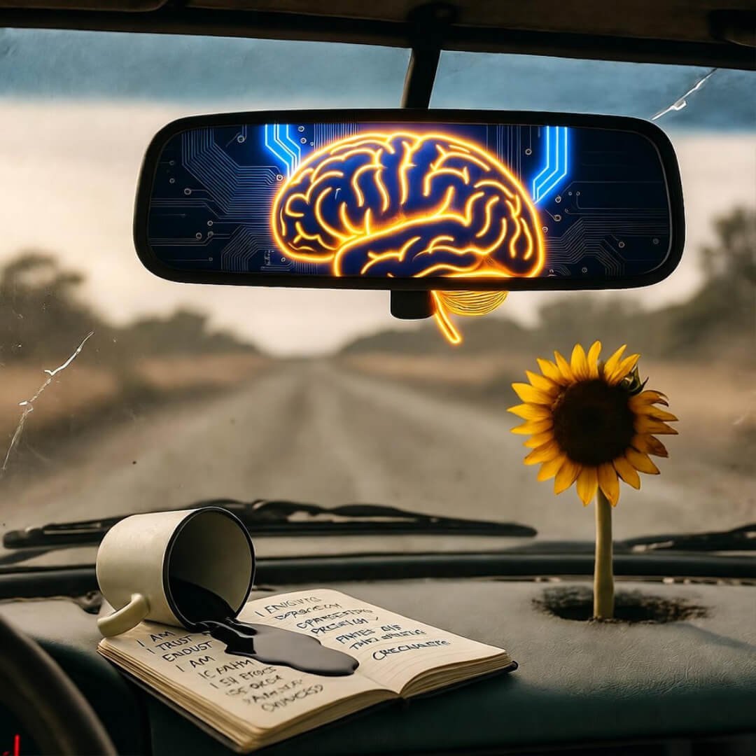 Cracked mirror reflects neon brain; spilled coffee, wilted sunflower.