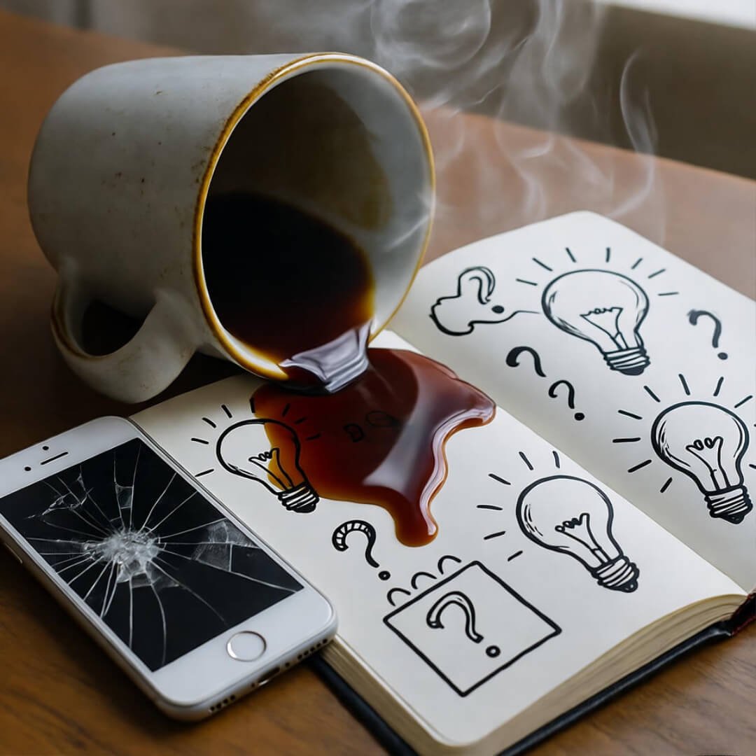 Coffee spill on doodled notebook, cracked phone.